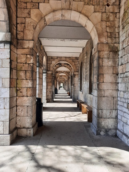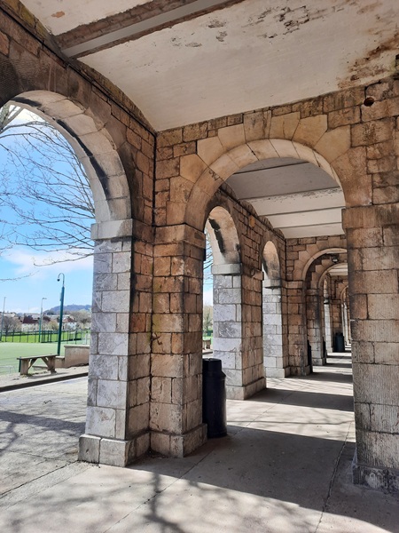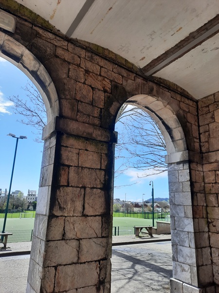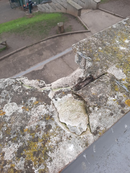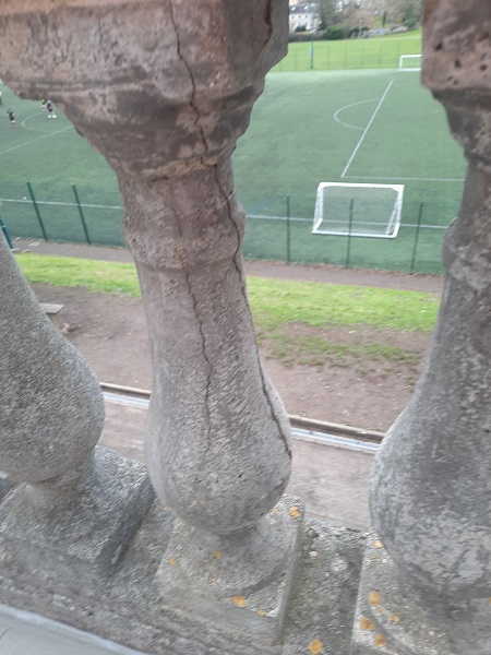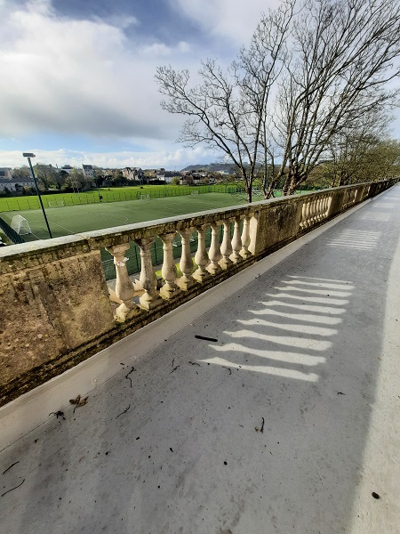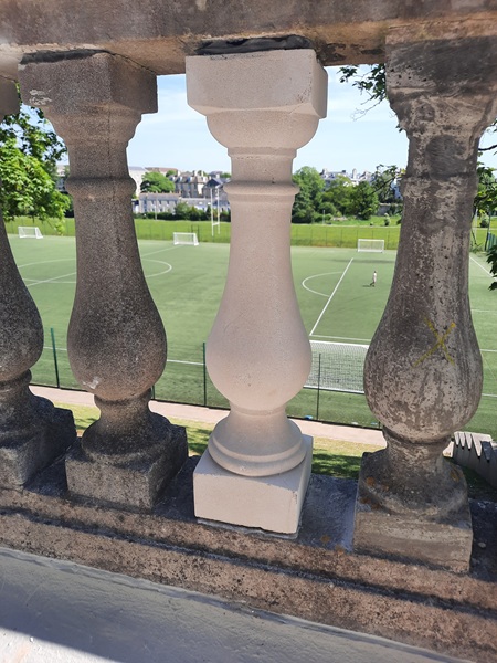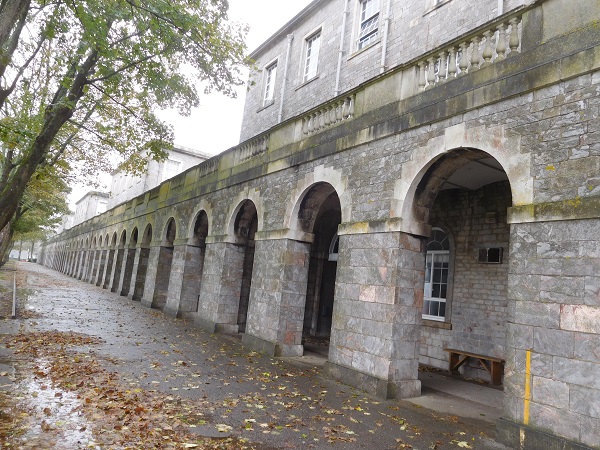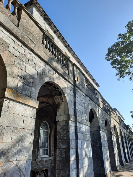 Built primarily from Plymouth limestone with Portland stone dressings, the buildings of the former military hospital consist of an admin block and four square ward blocks that are three storeys high and built in a line which are joined together by an arched arcade that is roughly 545 feet (166m) long, and at that time one of the longest arcades in Great Britain. Above the arcade sits a Portland stone balustrade that runs its full length. The school had contacted us to take a look at the balustrading.