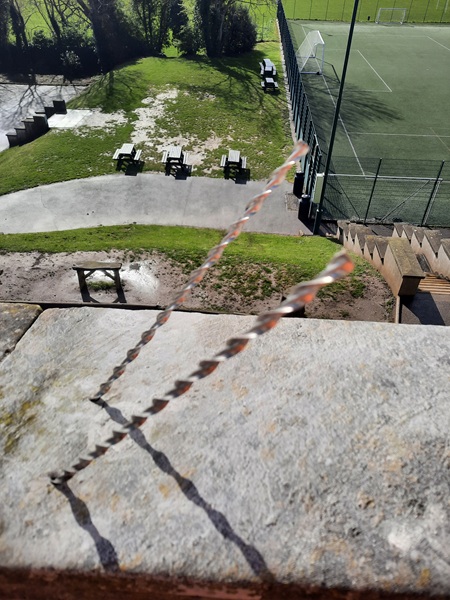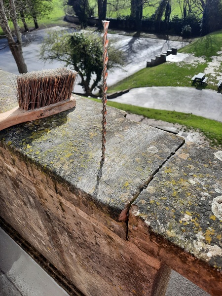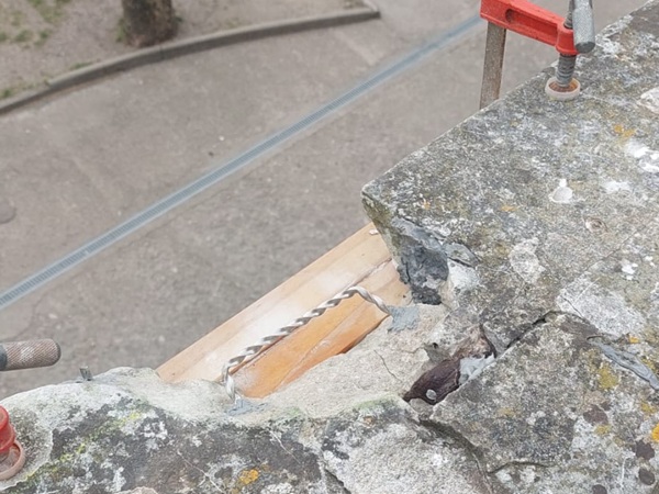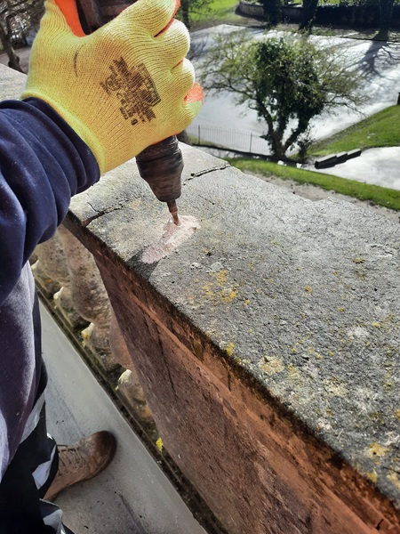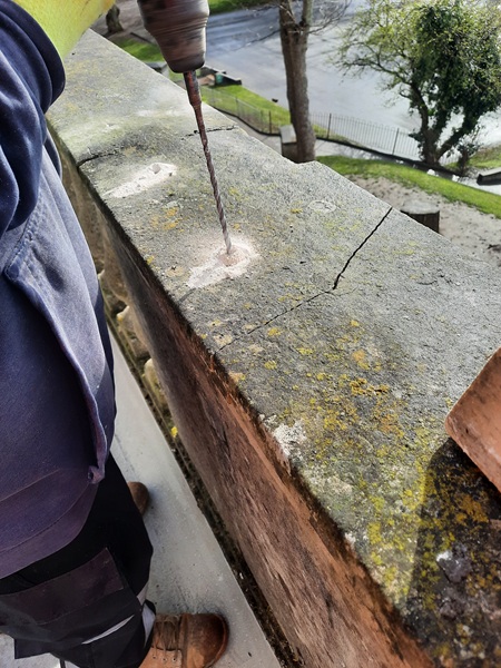 Sections of the coping were also loose and the main concern here was the possibility that masonry could fall out onto the area below, posing a serious health and safety risk. First of all we set about stabilizing the loose sections of coping. This we did by drilling 6mm diameter holes through the coping and into the wall section below. These went in to a depth of roughly 200mm.