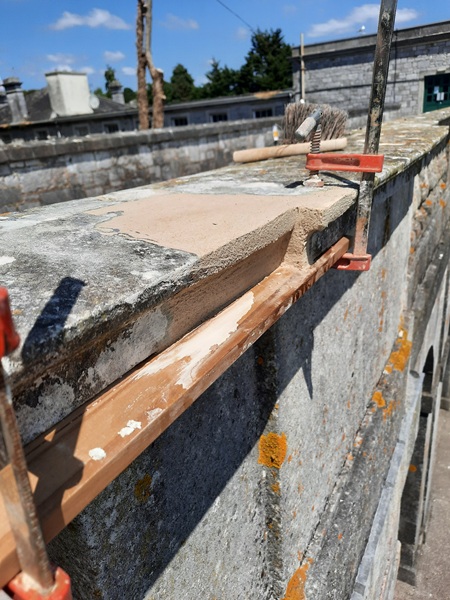 The helical ties twist as they are hammered into place, much like a giant screw. Being slightly bigger in diameter than the hole it goes in, the ties bite into the sides of the hole. They are hammered in 20mm below the surface of the finished coping leaving just a small hole that is made good with a Portland stone repair mortar. This method causes minimal disturbance to the masonry, requires no epoxy resin to fix the ties and once in position they are not coming out. These ties were fixed all along the length of the coping where required. Next we turned our attention to missing sections of coping that had fallen out over time.
