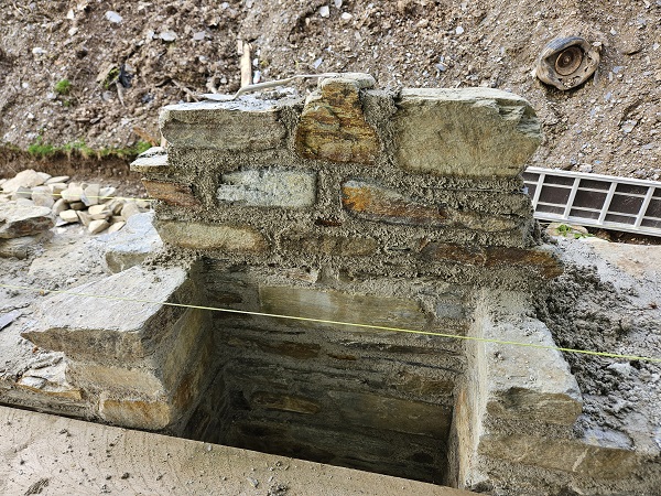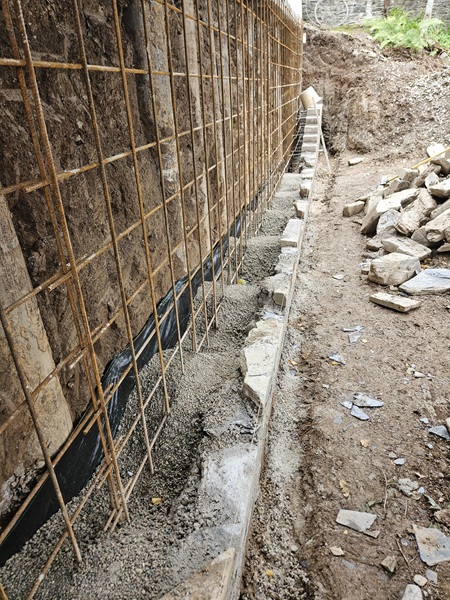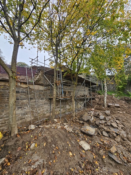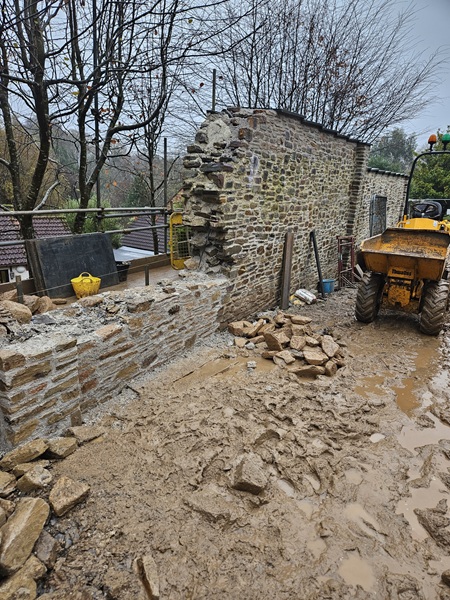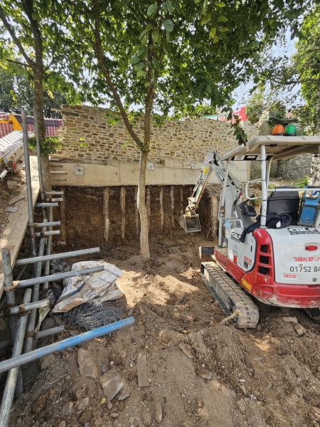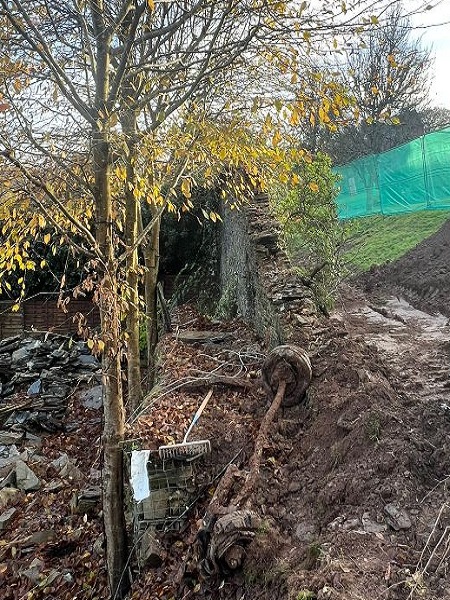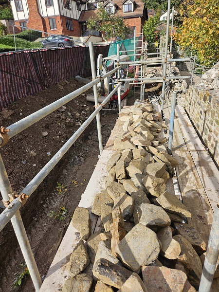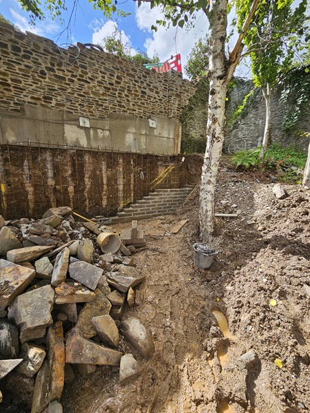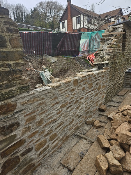 The wall had collapsed due to a spell of heavy rain and high winds and its cause for it falling down was attributed to storm damage, so the cost for the rebuild ultimately fell into the hands of the insurance company who undertook the risk to insure the property. A structural engineer was appointed to survey the damage and issue a full report along with structural drawings detailing the specifications for how the wall had to be rebuilt. The main contractor chosen to carry out the work were Garness Contracting Ltd, a company based in North Devon. They soon got the work underway by getting a temporary road access in place and the foundations for the new wall ready. Next they had to excavate the ground down to the base of the existing stone wall along the full extent of the collapse.