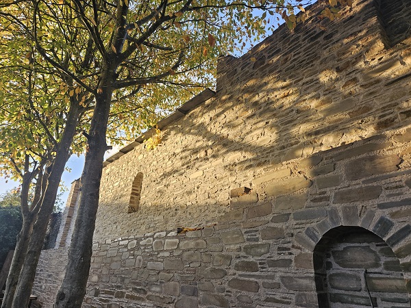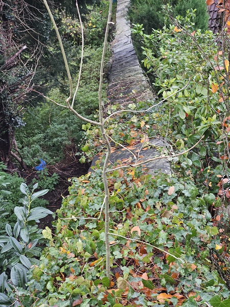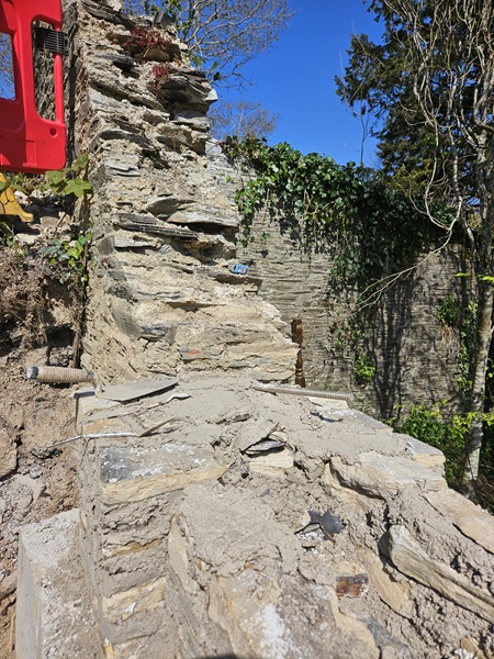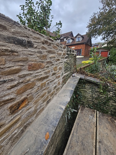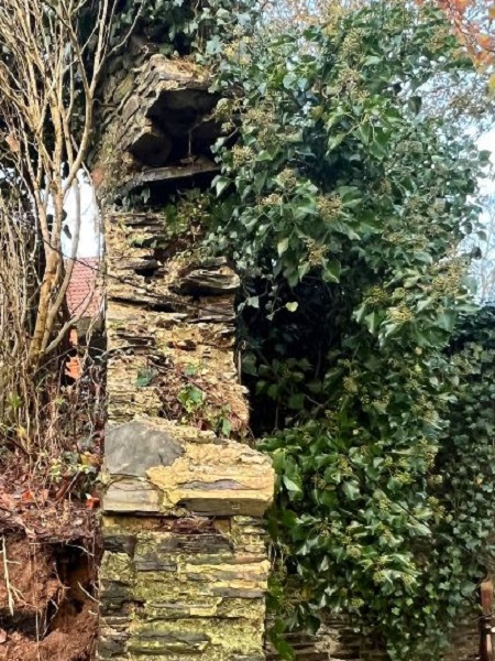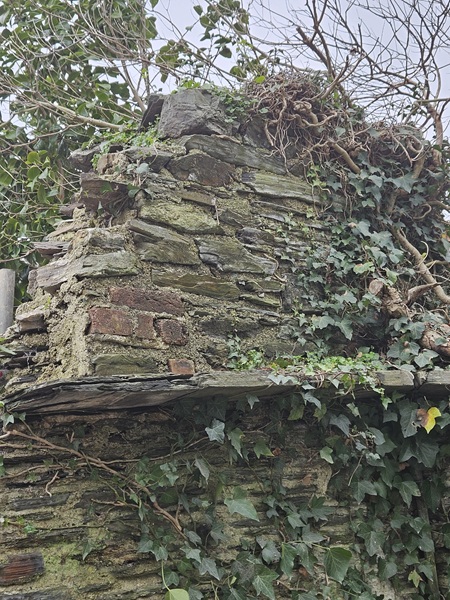 This section of wall jumped up higher again which tied into the last remaining section of the original wall. The remaining wall was covered in ivy and vegetation growth. Remains of the original slate coping was still visible and the stonework above it for some reason must of been built on top of the coping at a later date. It was also less wider than the original wall being 450mm wide.