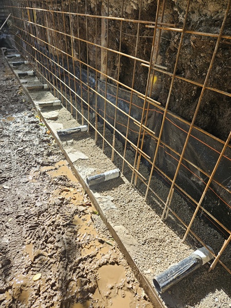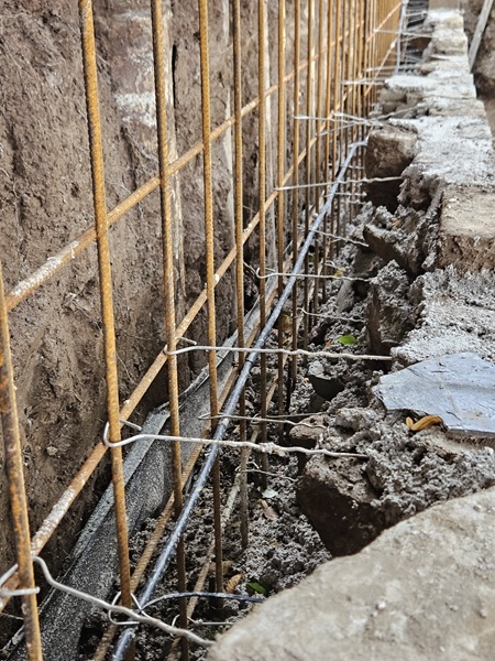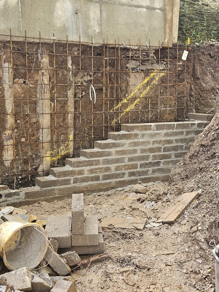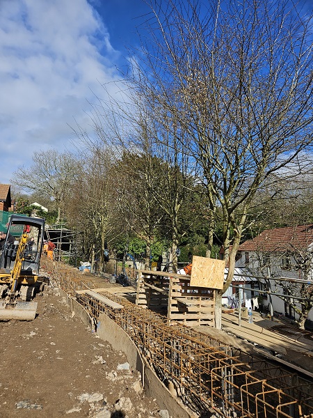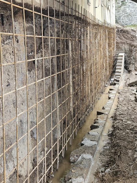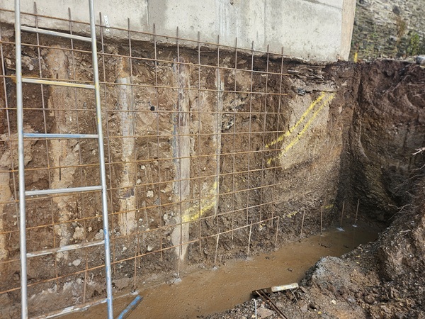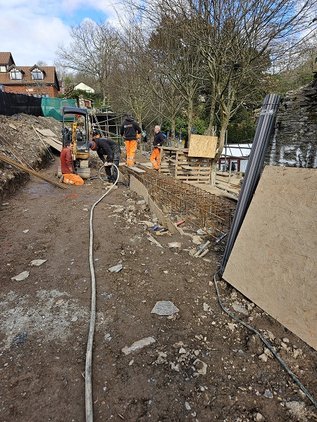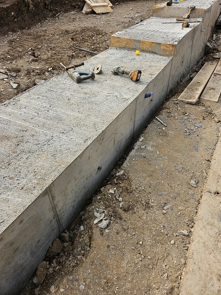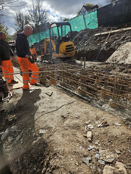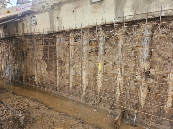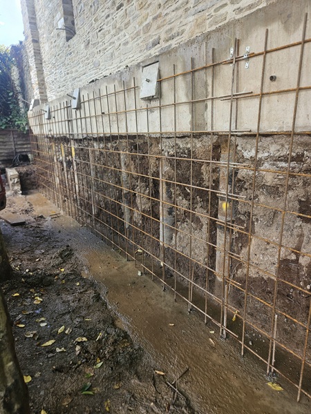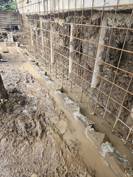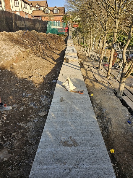 Once all the steelwork was in situ, shuttering was placed either side of the steel cage and a mass concrete beam was cast to form a new stepped foundation.