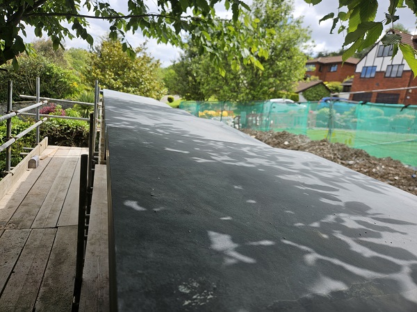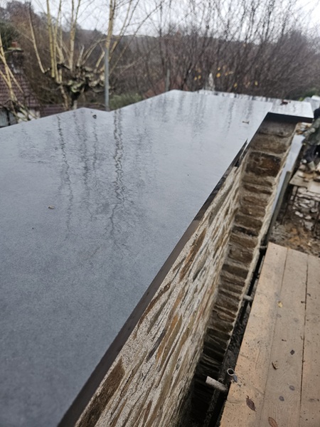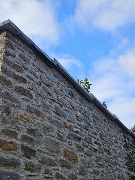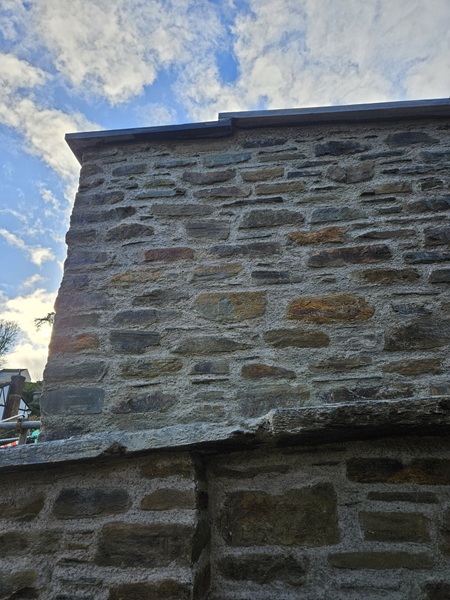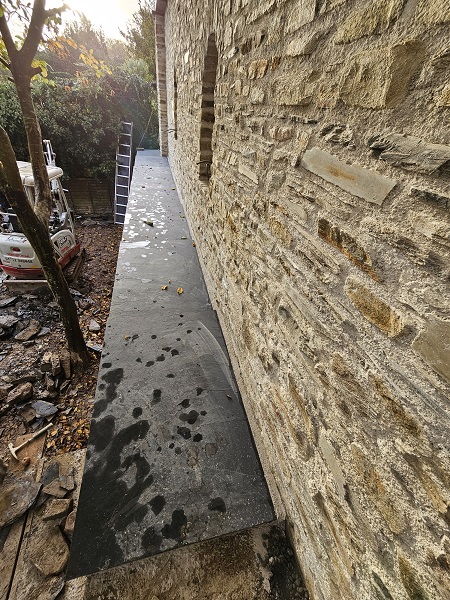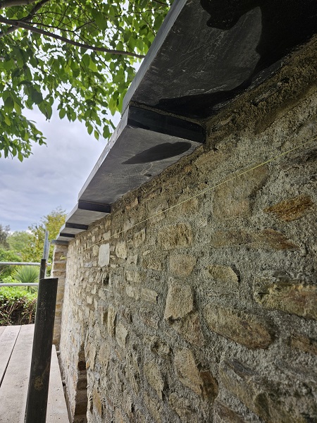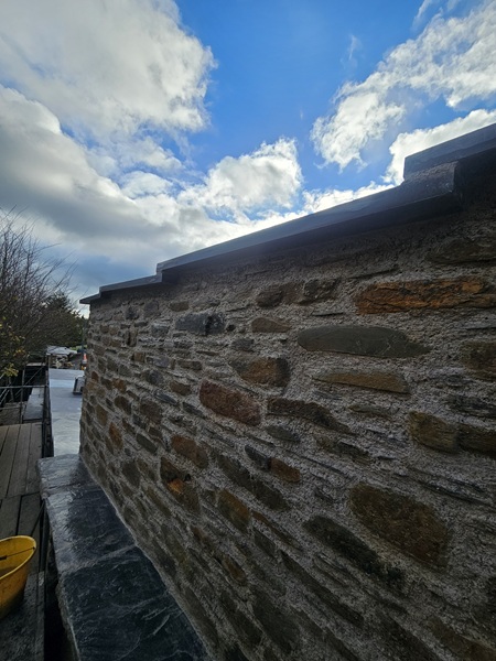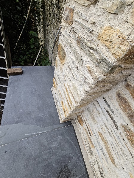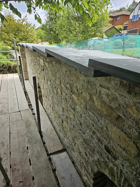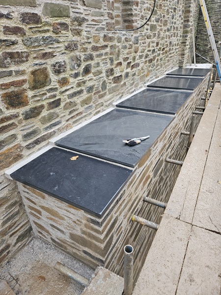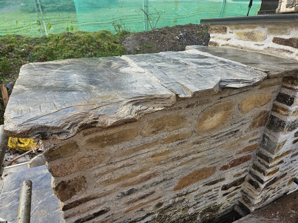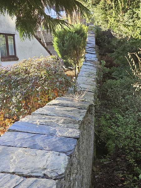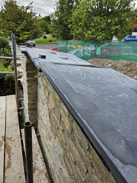 We also overlapped the slates by 50mm. This is a far better way than just butting the slate up to each other as the jointing over time would be vulnerable to falling out, vegetation taking root and the copings lifting. By overlapping each coping it locked each section into place. It also help to blend in with the original copings, which where up and down, due to their different thicknesses.