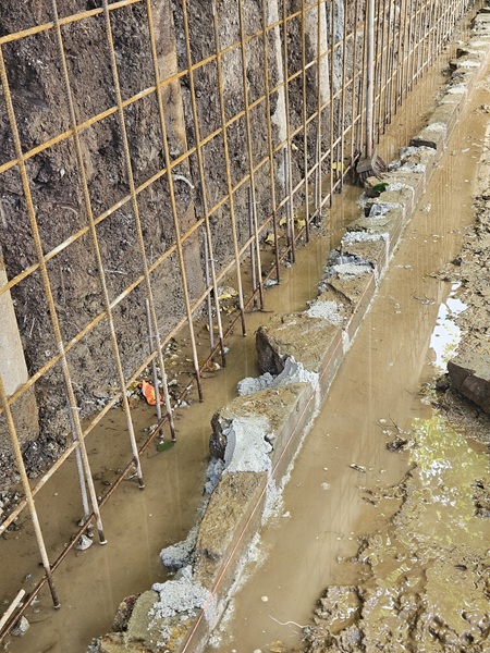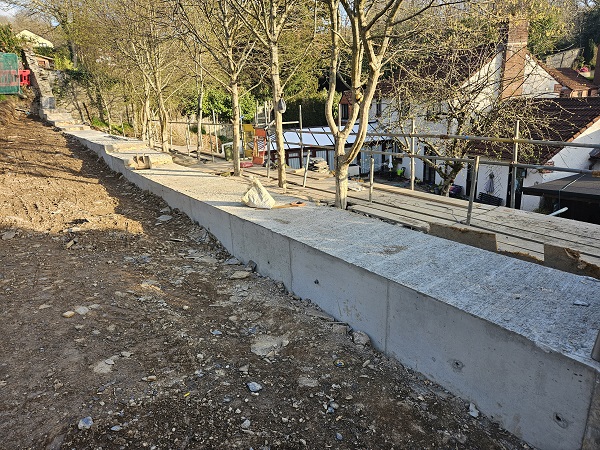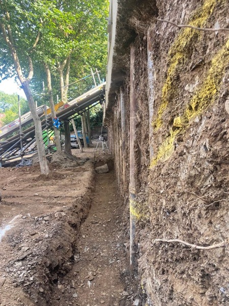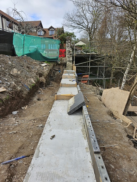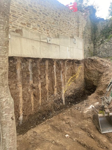 Then a double row of piles encased in concrete were sunk into the ground in line with the wall and these went down to a depth of between eight to nine metres until solid ground was hit. The double row of piles were staggered and put in about 900mm centres apart and roughly forty piles where put down in total. The steel from the tops of the piles projected out of the ground by 600mm.