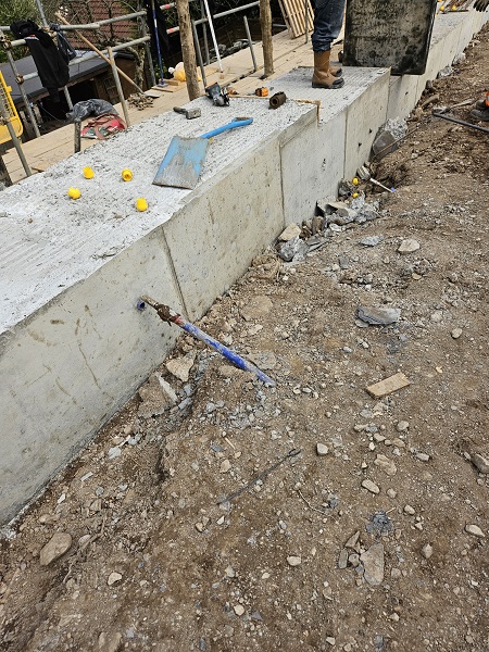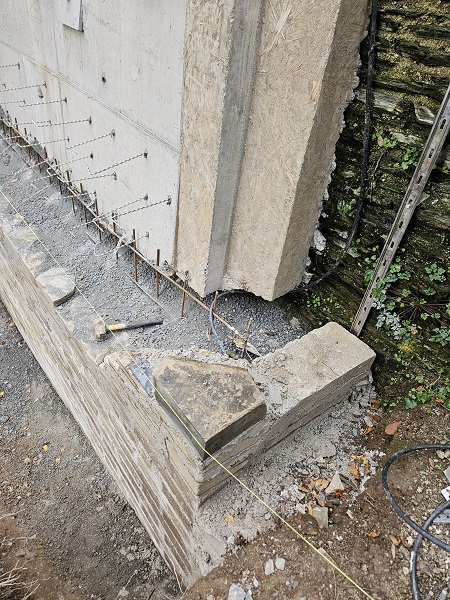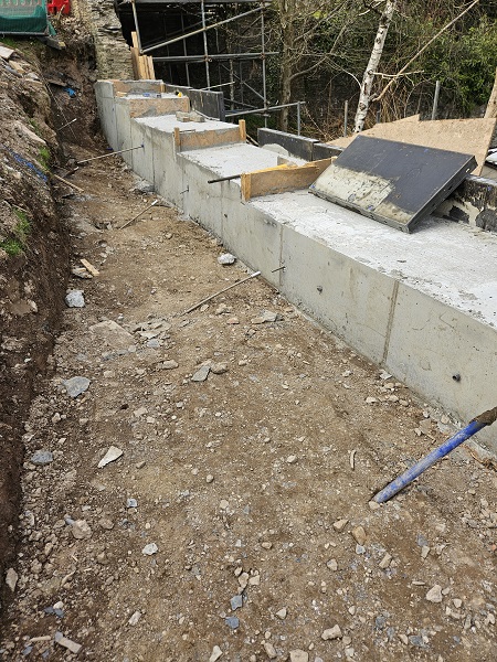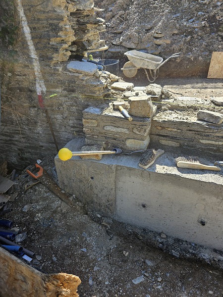 The new 900mm wide reinforced concrete beam foundation was now essentially sat on top of the pilings. It was at this point that Garness Contracting Ltd contacted us giving instructions to carry out the stonework. Having worked out what materials we needed to get started, a start date was agreed upon and the first batch of materials were delivered.