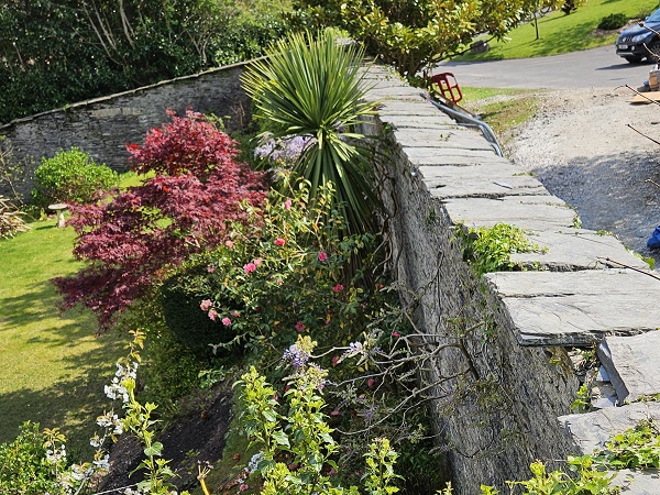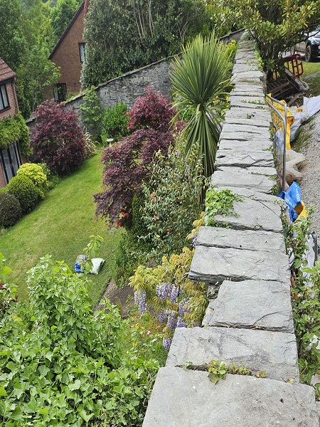 This was the highest section of the wall and was roughly eight metres above the level of the garden below it. We next laid the slate coping to the lower level section of wall from the opening in the wall up to the pier.