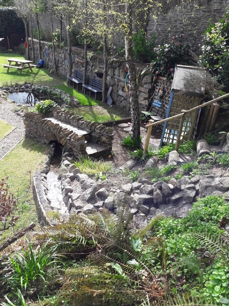 There is an artist’s impression from one of the National Trust’s information boards depicting the Rumple Quarry engine house which was built in the late 1860’s. It housed a powerful steam engine which hauled the stone up from Rumple Quarry to the waiting trains on the Tavistock line. Rumple Quarry was considered a dangerous place to work due to overhanging rock formations and two men died at the quarry in 1861 after part of the working cliff face collapsed and slate production here ceased for two years.