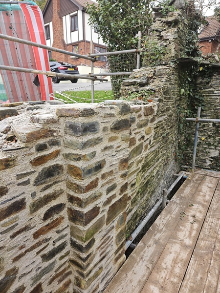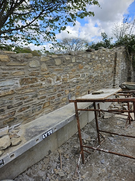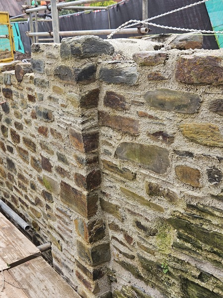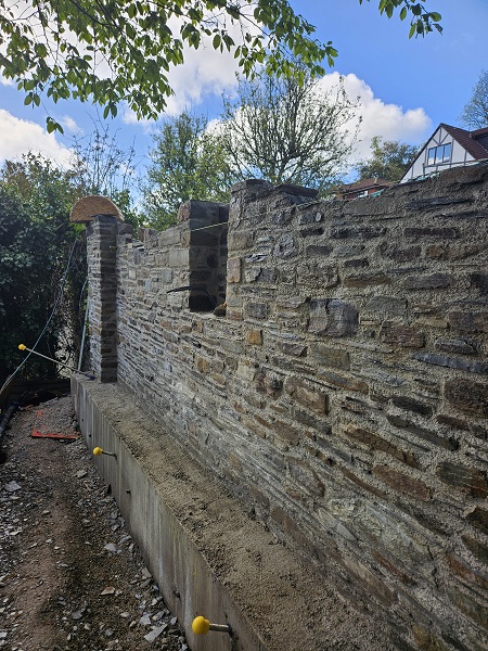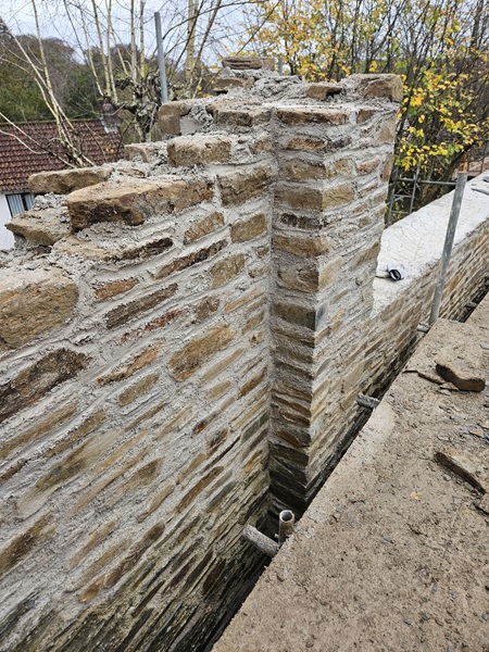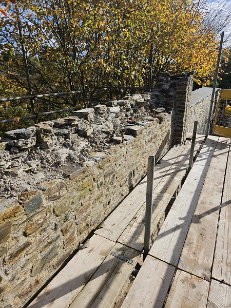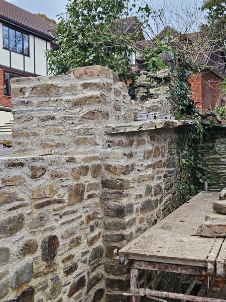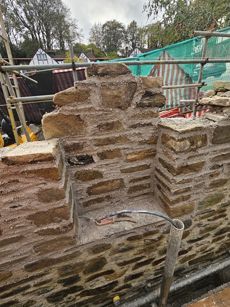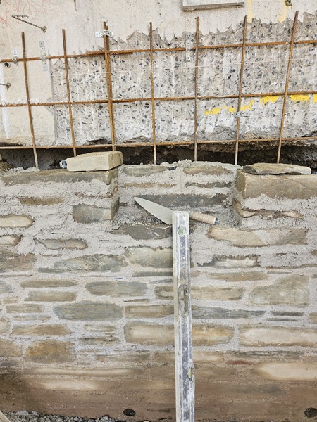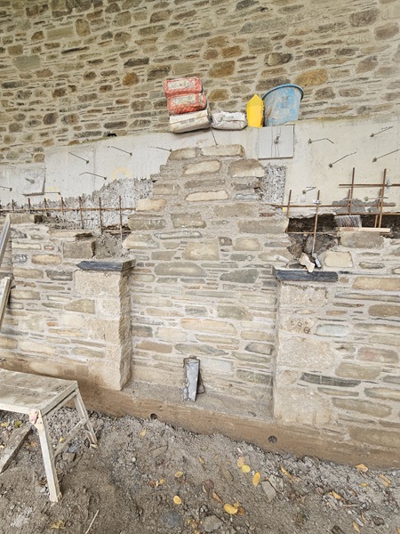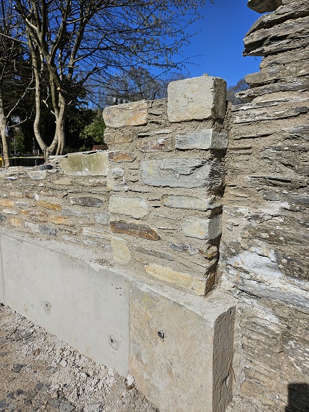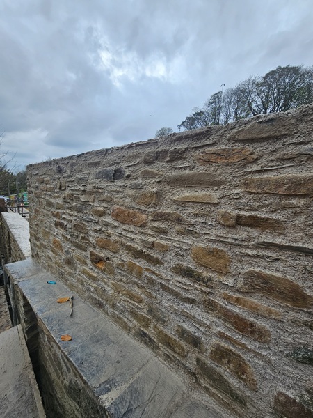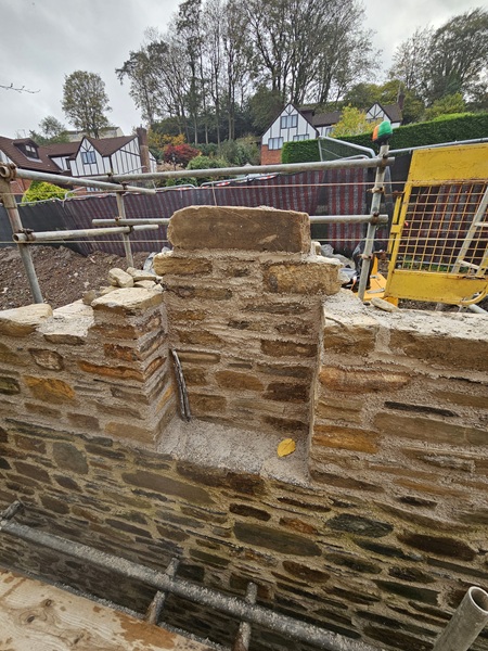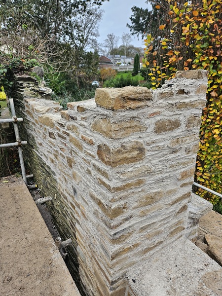 Another pier was built at this end of the wall where the new stonework was tying into the old and more of the Helical ties were built in as the wall went up.
