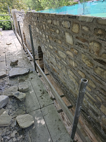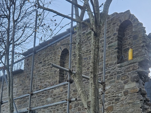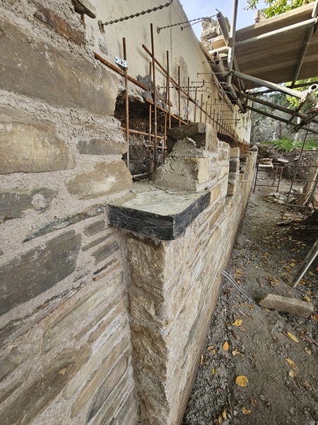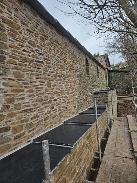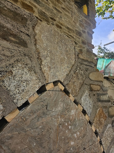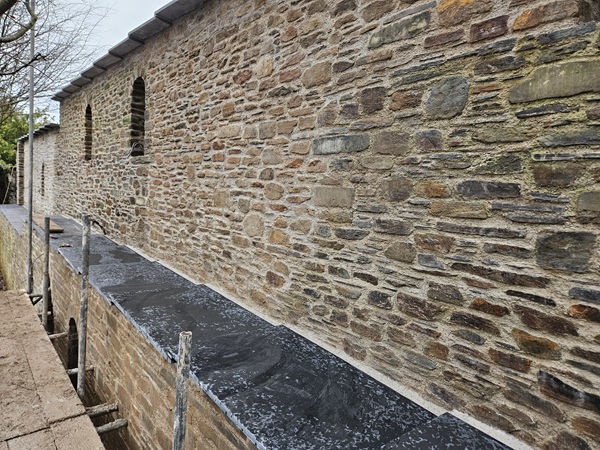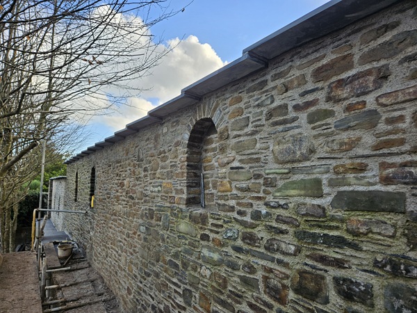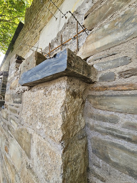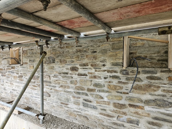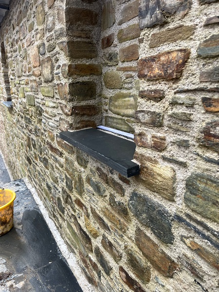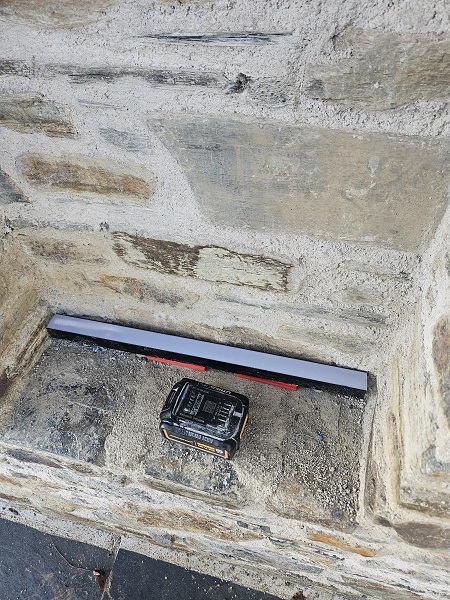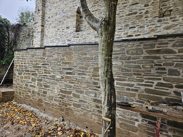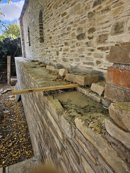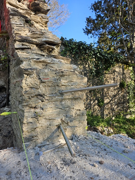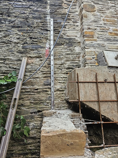 Once in situ, the tie bars are fixed into place with epoxy resin. The epoxy resin is kept back 25mm from the face of the stonework, which is then pointed in with lime mortar. The ties are set in every 300mm apart over the full height of the wall and are fixed to both sides. This gives lateral strength preventing the leaning section of wall moving any further. It is classed as a structural repair and is cost effective as it causes minimal disturbance and a much cheaper option that would require the leaning section to be taken down and rebuilt.
