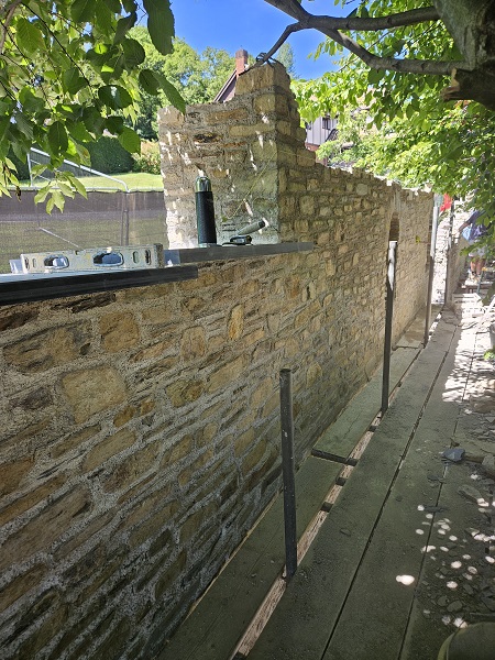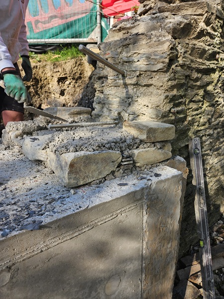 At the other end of the wall a couple of 25mm diameter stainless steel threaded bars were drilled and resin fixed into the existing section of the old wall. These went in to a depth of about 300mm and would help tie in the new stonework to the old.
