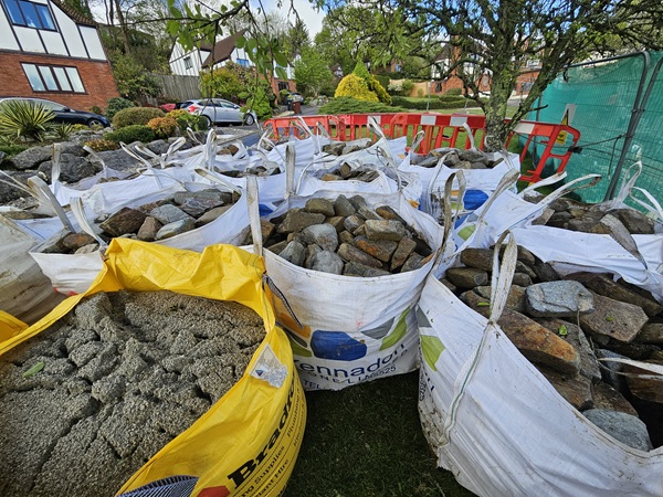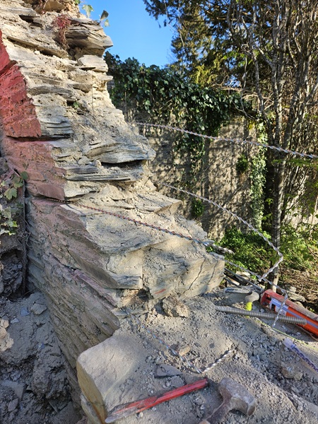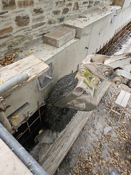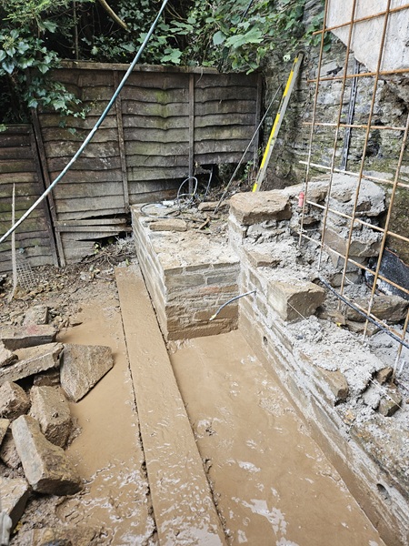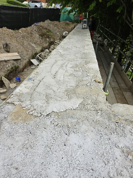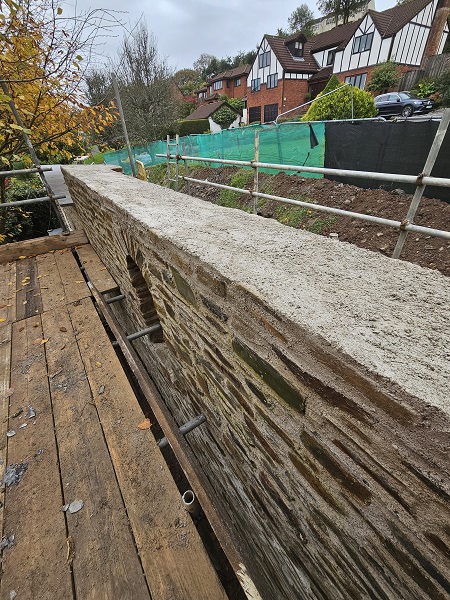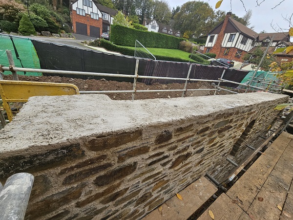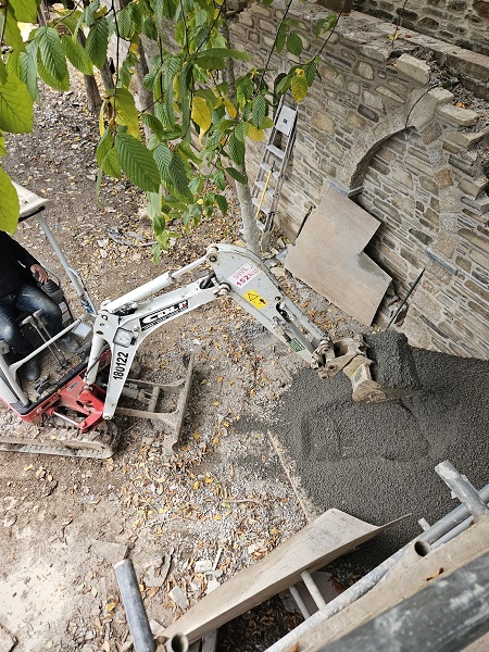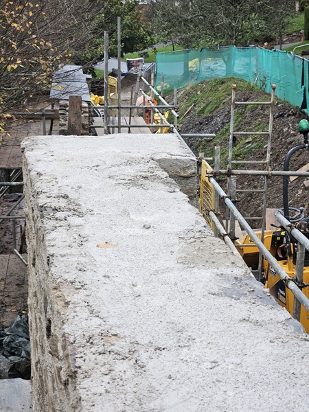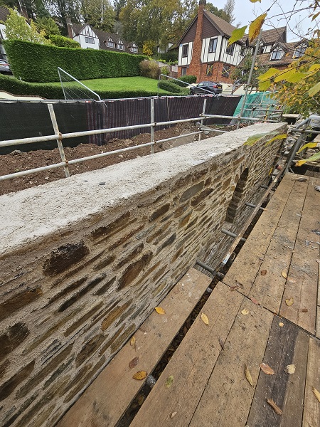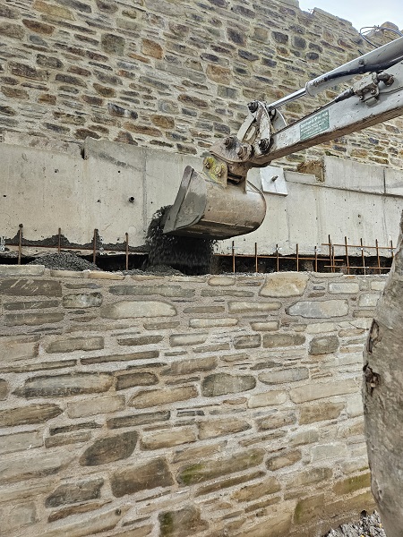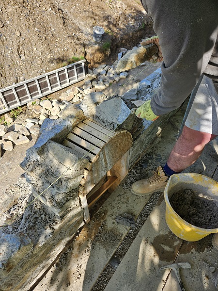 Once the new stonework was up roughly a metre or so high, it was time to backfill the void behind the wall with a semi-dry lean mix concrete to form a solid reinforced mass. This was achieved by tipping the semi-dry concrete through a gap between the scaffold into a pile down to the garden below, and from there scooped up into a mini digger bucket and placed in behind the wall. This first batch of concrete consisted of roughly ten cubic metres to fill the void.