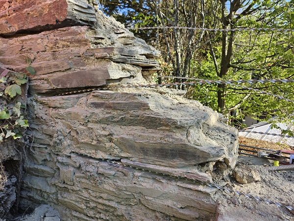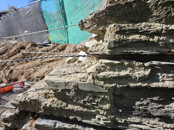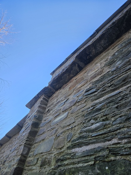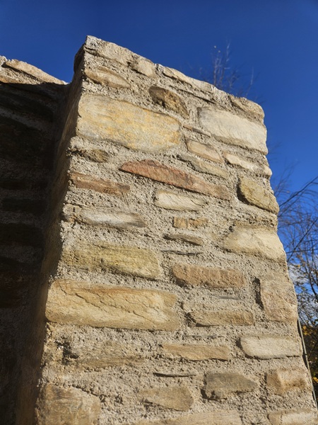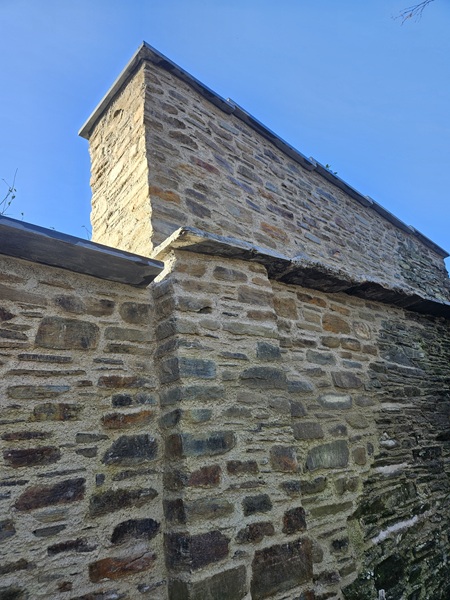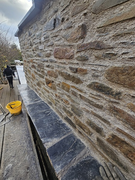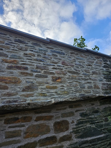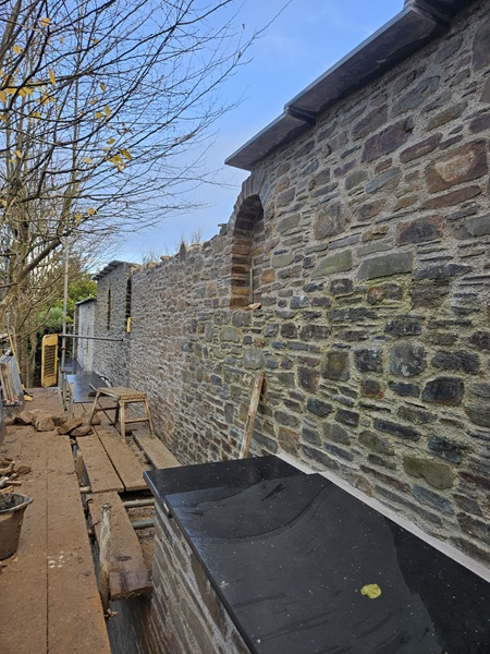 Stone has been quarried here at Yennadon for more than a hundred years. But, in geological terms this slate stone is about four hundred million years old and formed during what is known as the Devonian period. That’s about a hundred and fifty million years before the dinosaurs even set foot on Earth. Yennadon stone has metamorphic properties and metamorphic rocks are pre-existing igneous, sedimentary or other metamorphic rocks transformed by intense heat, pressure, and chemically active fluids deep within the Earth’s crust, causing mineral and structural changes without melting them completely, resulting in new textures like banding (known as foliation) or interlocking crystals, seen in rocks like slate, marble, and gneiss. The stone supplied by Yennadon that we used is classed as small walling stone. It has varying rustic colouring that can be laid on a bed between 100mm and 250mm wide. Perfect for what we needed as the wall we were building was 500mm thick. The mortar specified consisted of three parts sharp sand and one part NHL3.5 lime. Soon we were getting the wall up to its height.