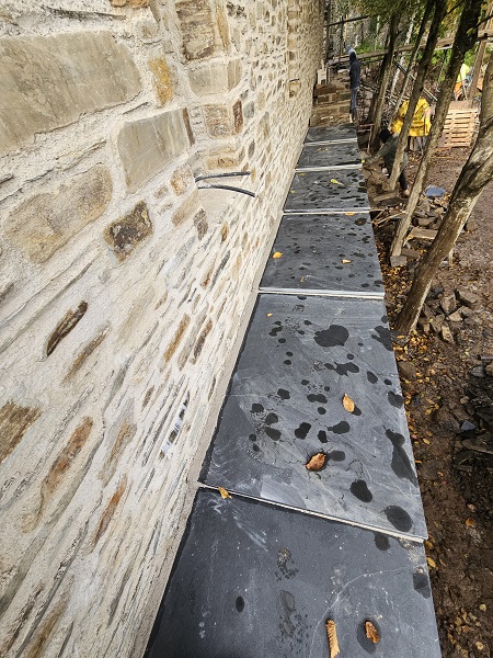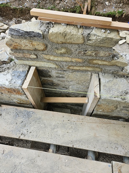 This system of drainage would allow any build up of water pressure behind the new wall to escape. Once all the drainage holes were set in we carried on bringing the new stonework up.