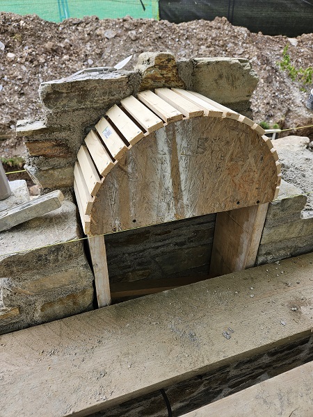 We were not quite sure what they were but they looked like ‘Fairy Inkcaps’ (Coprinellus disseminatus), a non poisonous species, but after a few days they had completely disappeared. As we were already building six arched niches into the wall above, the client requested some additional features to be built into the lower pile facing wall. This was going to be a gothic style recessed door opening with two further arched niches on either side. Some rough hewn granite was sourced for the quoins and the arch to create the gothic door feature.