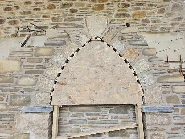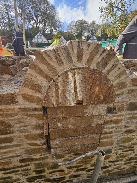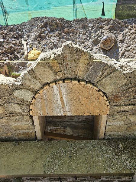 These are all put in place using wooden folding wedges. This makes the removal of the timber centring once the arches have set much easier. Suitable stone was selected and the arches were then set in place.