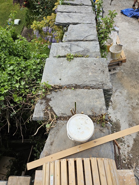 On the clients side of the wall the slate coping had an overhang of about 180mm, which is seven inches in old school measurement. This, on average, matched the overhangs of the old slate copings on the original wall.