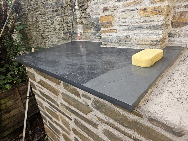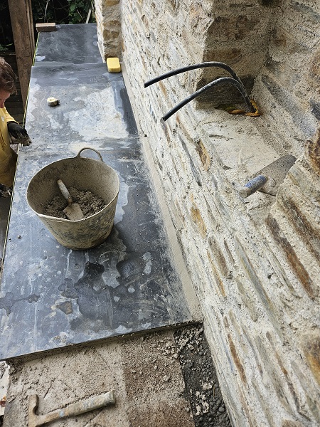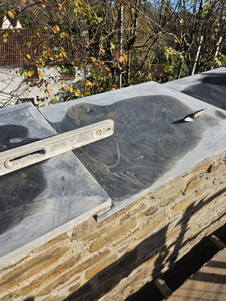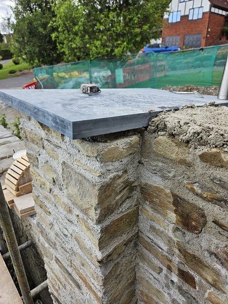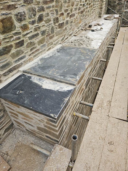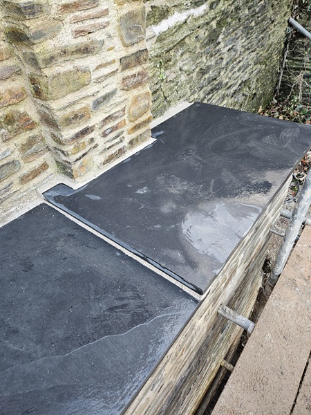 The new slate was cut into sections 750mm wide, 900mm long and 30mm thick. It was supplied by Kenyon Canopy (Slate & Stone) Ltd, based in Saltash, Cornwall. Now that we were up to height on one section of the wall we set the copings in place from the first pier to the second.