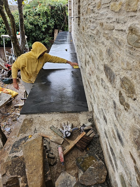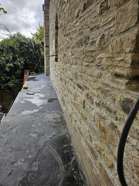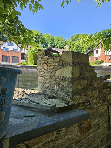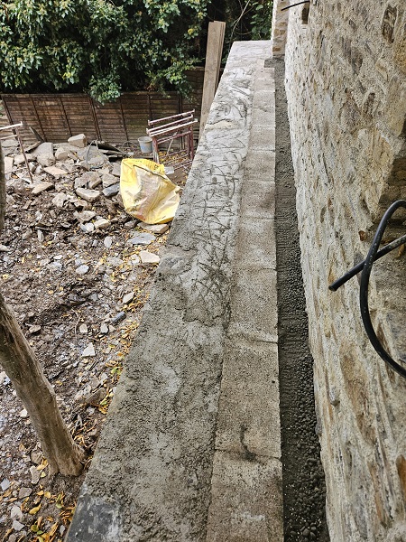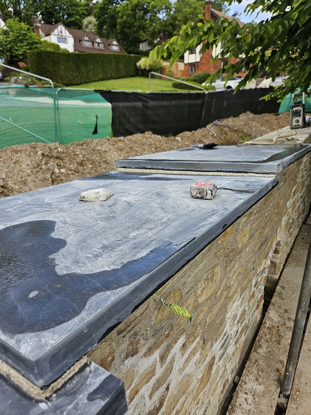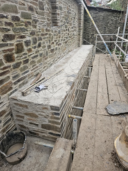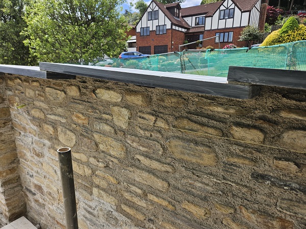 This section was soon built up to finished height with a 50mm cross fall to received the slate coping.