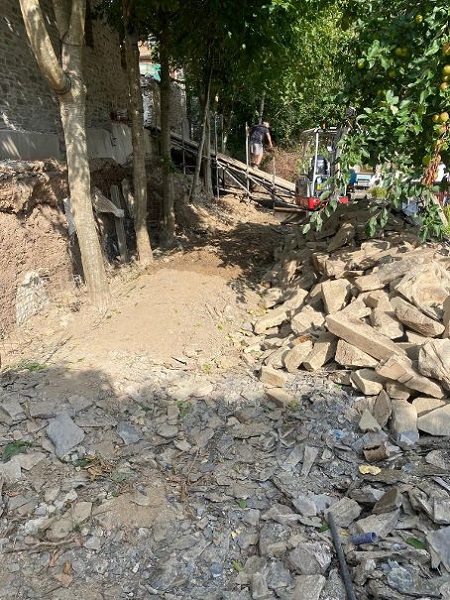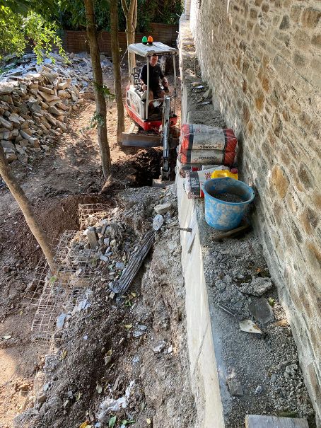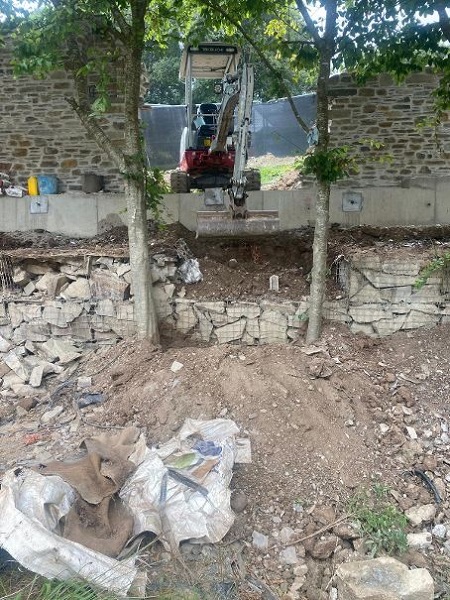 Before the wall had collapsed during the storms, at some point in time, the garden side of the wall had gabion baskets put in place that were filled with stone along the length of its base. This was to help retain the sloping ground up against the bottom of the old wall. When the old wall collapsed, it had disturbed the gabions to such an extent raising concerns that the soil between the new piles in behind could wash out overtime and cause problems to the new wall in the future. At this stage the structural engineer was called back in to determine a way forward and instruct on what was needed to proceed. Eventually it was deemed that the existing gabion wall was to be removed and the ground behind taken back to expose the piling. Then a new concrete foundation laid in preparation for a reinforced stone wall that was going to be built against the new piles. Once all this was established we had to get the machinery, consisting of a small mini digger and a power barrow, through the gap in the wall down into the garden below.