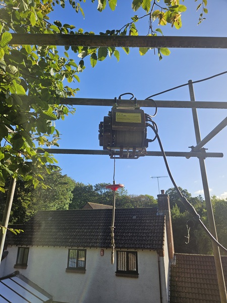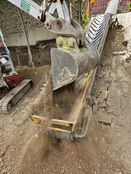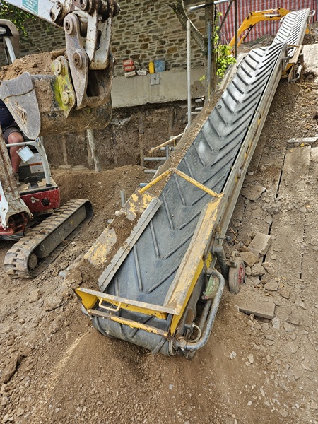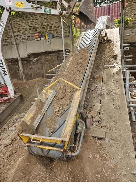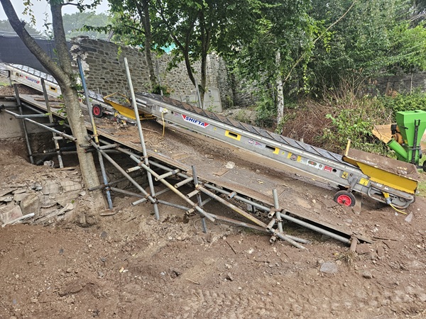 At this stage we were ready to start the stonework which was going to be built up to form the wall for the new pile facing to a height which would also cover the foundation above. But first we had to get rid of the conveyor ramp and adapt the scaffold requiring a hoist the get all the materials down going forward.