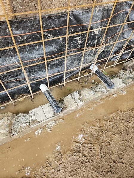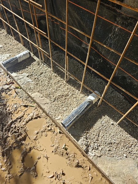 Now that the base had been set out we had to incorporate drainage into the wall. Plastic pipes with a diameter of 75mm were cut and built in level at 900mm centres. These were placed 150mm above the concrete foundation eventually allowing for the finished ground levels to be the bottom of the pipes.