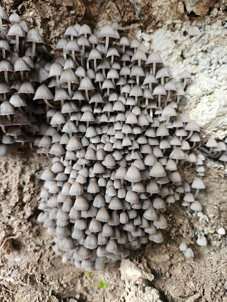 One day we turned up and noticed a group of mushrooms growing against the soil on the back of the walls between the piles.