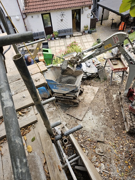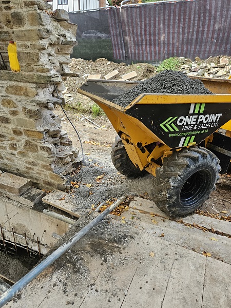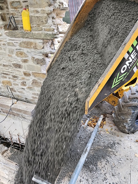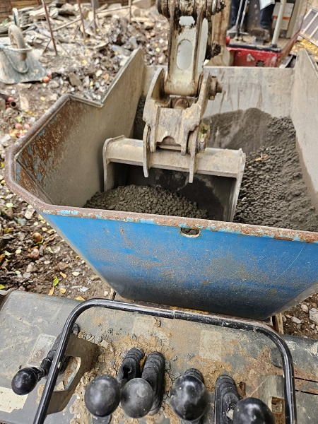 The power barrow was loaded up and then used to feed the mini digger as it placed the concrete in behind the wall.