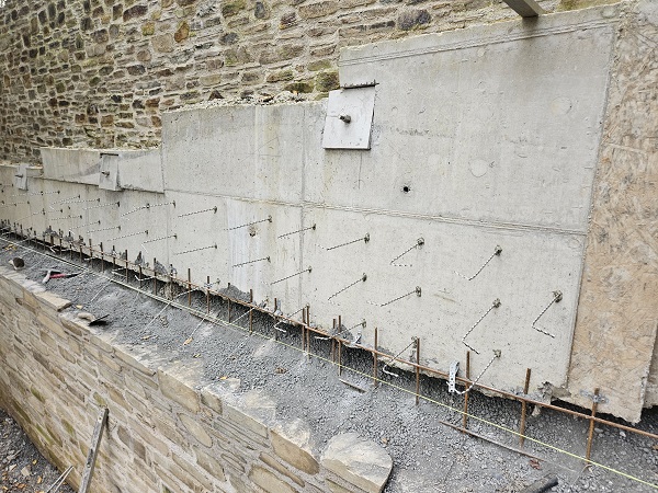 Additional 8mm diameter stainless steel ties were drilled and resin fixed into the concrete foundation to tie the stonework back into the concrete. The square stainless steel plates you see here set into the concrete are bolted onto 25mm thick stainless steel threaded bar. These bars are set in at an angle of twenty-five degrees. They are cast within the concrete and go back behind the wall about twelve metres or so until they hit bedrock which are then grouted in situ. This is to prevent the new foundation from bending along its length as it is retaining a substantial amount of ground behind it. These bars are spaced about 2.5 metres apart along the length of the foundation. The section of pile facing wall directly under the section of wall above where we had already laid the new slate copings was built up to its finished height.