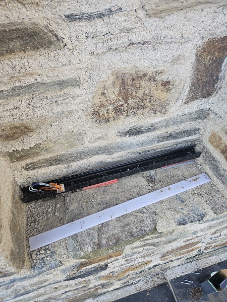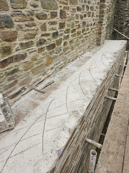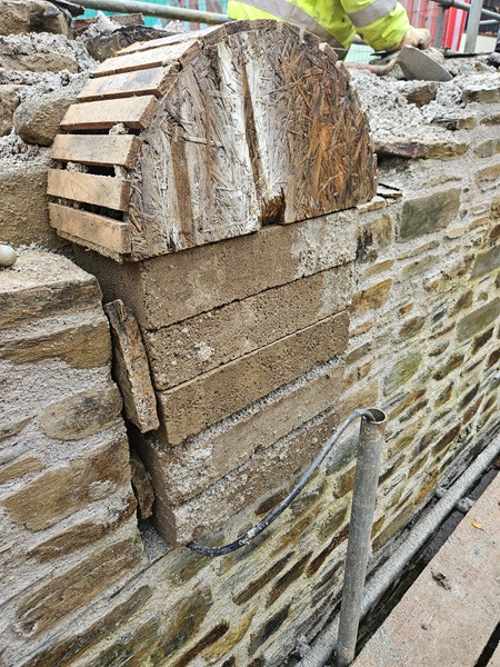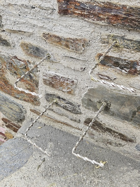 Electric cables were built in along the bottom to feed external sockets. As the new stonework went up we built in stainless steel ties that locked in around the steel mesh in behind.