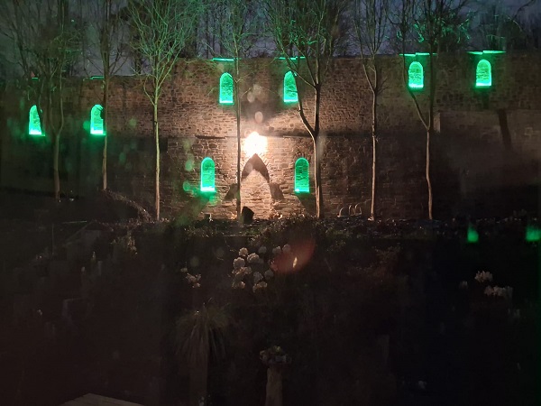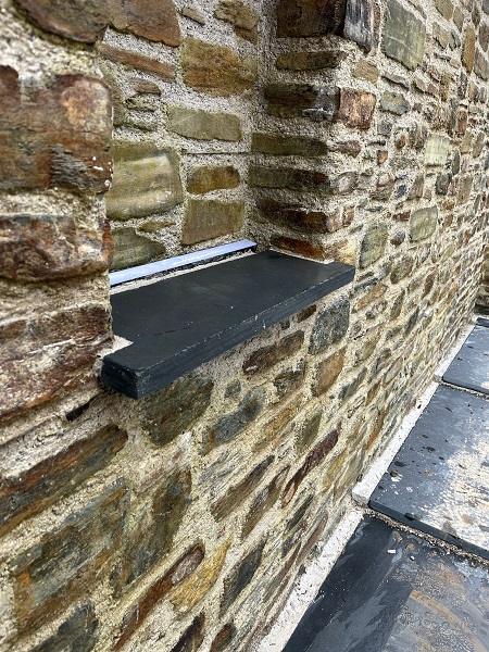 Another job was to finish the recessed niches we had built into the wall. There were six on the upper section of wall and two on the lower section. The electricians had been in to connect all the lights and outside plug sockets and we finished off the niches by putting in some slate sills. The lights fitted were green LED strip lights that went along the back of the niche. Once switched on they would light up the arched openings along the wall.